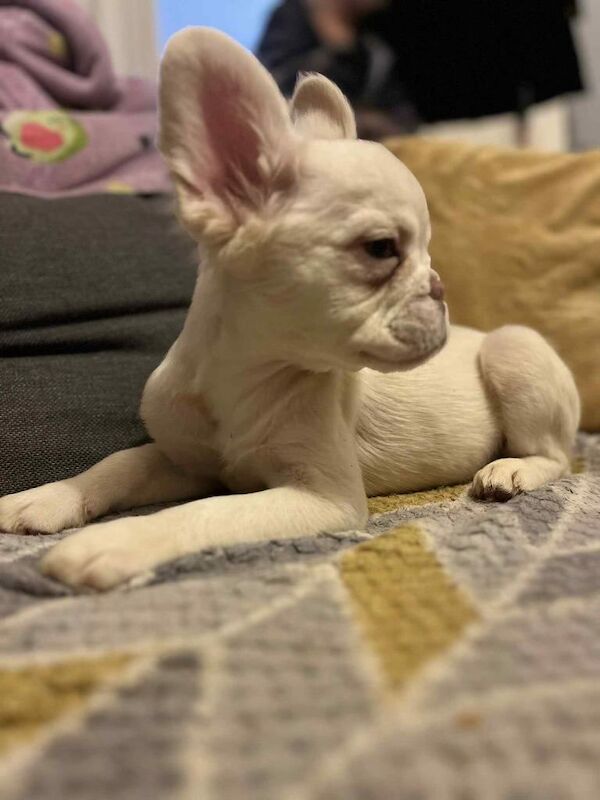 She’s a very calm, gentle pup, she’d rather lie down on her back all day and get belly rubs or sleep. She will come with her bowls, toys, harness, lead, blanket, some puppy food and sachets and a piece of fabric that smells like her mum.